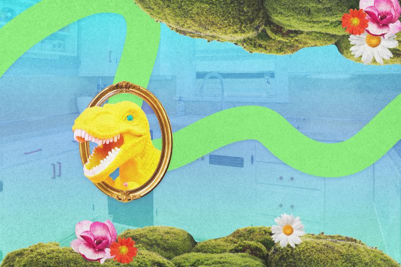 To paint a better picture: Tay has a large mirror that she decorated with moss and flowers, and so does Kaarin. Tay has a squiggly green line that she painted on the wall going down her stairs, and Kaarin has a squiggly green line painted in her kitchen. Tay displayed her boyfriend’s monster head art pieces on the wall, and Kaarin hung a series of dinosaur heads in picture frames. Tay also accused Kaarin of copying her green and blue gradient room after Kaarin decided to paint the cabinets in her kitchen green and blue, pointing out that Kaarin also purchased the peel-and-stick wallpaper Tay designed in collaboration with Otto Studio (though, she allowed, anyone can buy the wallpaper).