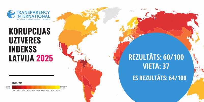 The Corruption Perceptions Index (CPI) of Latvia this year is 60, up one point from last year, putting it at the same result as it was two years ago.