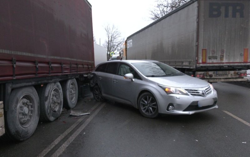 Rīgā Gustava Zemgala gatvē šodien kāda vieglā automašīna dabūja triecienu pa abiem spēkrata sāniem no divām smagajām automašīnām.