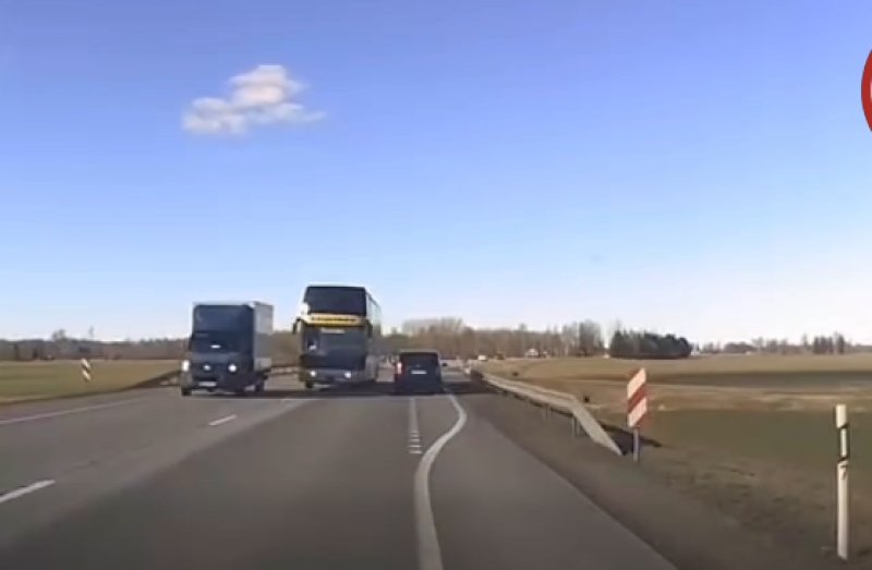 Запись, в которой зафиксировано, как рейсовый автобус Ecolines совершает опасный обгон почти впритирку к грузовику, прислал в паблик Satiksme.lv подписчик.