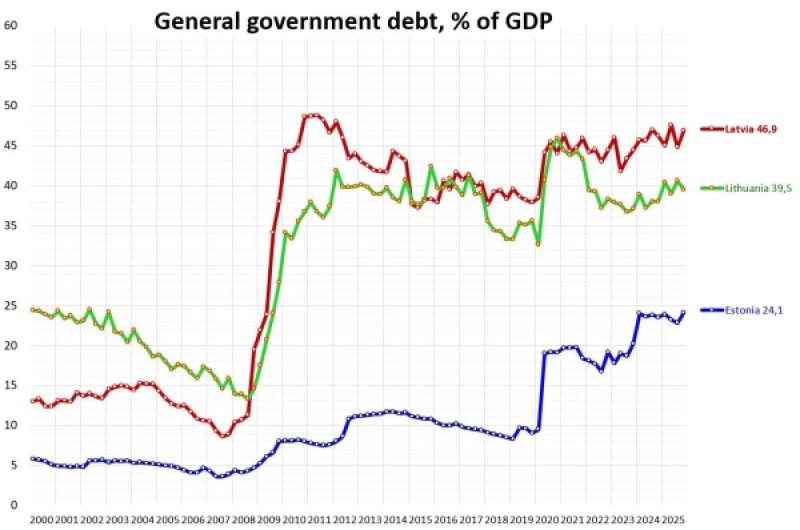 It cannot be said that our country is lagging behind Lithuania and Estonia everywhere. For example, in two indicators, we are ahead of them. However, this is one of those cases where it is better that we lagged behind... "In recent days, Eurostat has gathered key financial data on European countries for 2025. Comparisons between the Baltic countries show that Latvia (% of GDP) has the largest public debt and budget deficit. It is clear that in recent years, defense spending has had to be increased, and this affects the overall financial situation. But the total budget expenditures of Latvia (% of GDP), including the wage fund expenditures in government institutions, are higher than in Lithuania and Estonia. And in a number of indicators, the difference between Latvia and its neighboring countries has emerged precisely over the last 5 years," noted with sadness Janis Hermanis, an expert from the Latvian Confederation of Employers. Latvia's public debt relative to GDP reached 46.9%, while Lithuania's was 39.5%, and Estonia's was 24.1%.